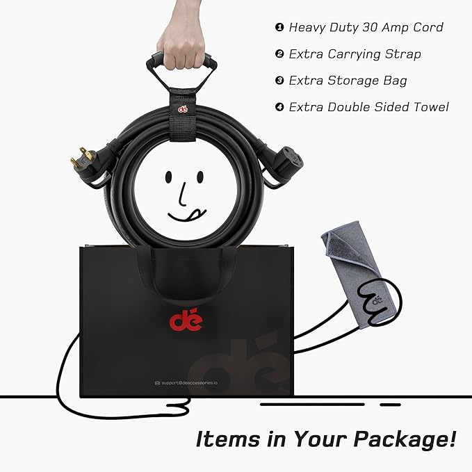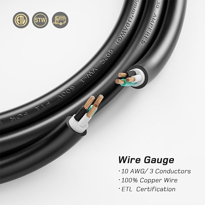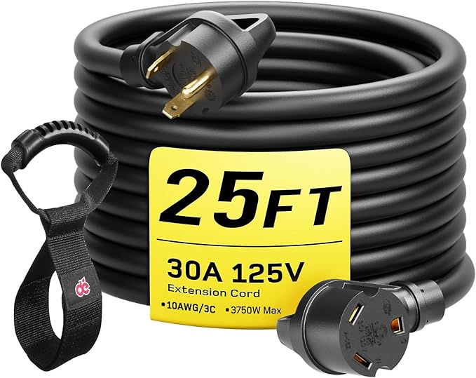 30 Amp / 125 Volt / 3750 Watt .Standard connectors is male (NEMA TT-30P) to female (NEMA TT-30R) heavy duty 10/3 gauge STW, durable heat-resistant PVC Construction and 100% copper wire for strong and stable current over long distance.